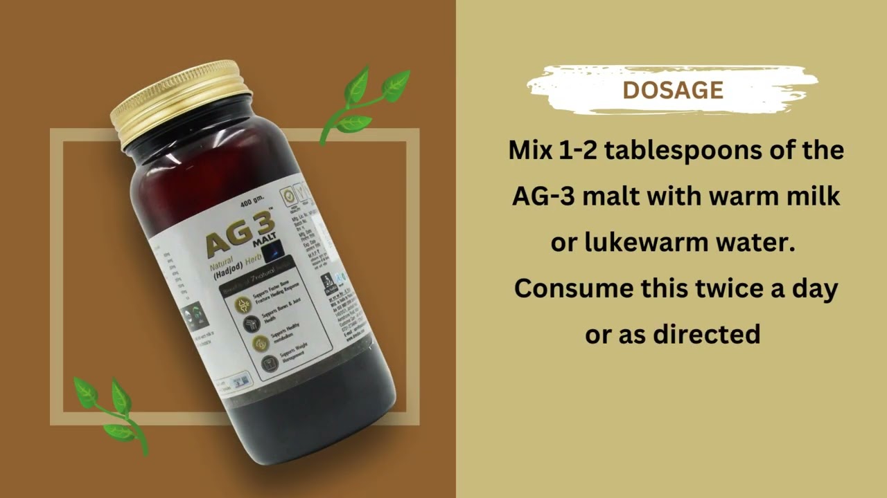 Introducing Dr. Veda's AG-3 Malt, your natural remedy for fracture pain relief. Crafted with precision and backed by science, this unique formula blends traditional herbal wisdom with modern medical innovation to provide soothing relief for fractures and associated discomfort. Derived from a proprietary blend of Ayurvedic herbs, Dr. Veda's AG-3 Malt is expertly formulated to target the root causes of fracture pain. Each ingredient is carefully selected for its analgesic, anti-inflammatory, and bone-strengthening properties, ensuring comprehensive support for your recovery journey. Mix a dose of AG-3 Malt with water or your favourite beverage and enjoy its soothing benefits. Experience natural relief from fracture pain with Dr. Veda's AG-3 Malt. Trust in nature's wisdom, backed by Dr. Veda's expertise, for a healthier, happier you.