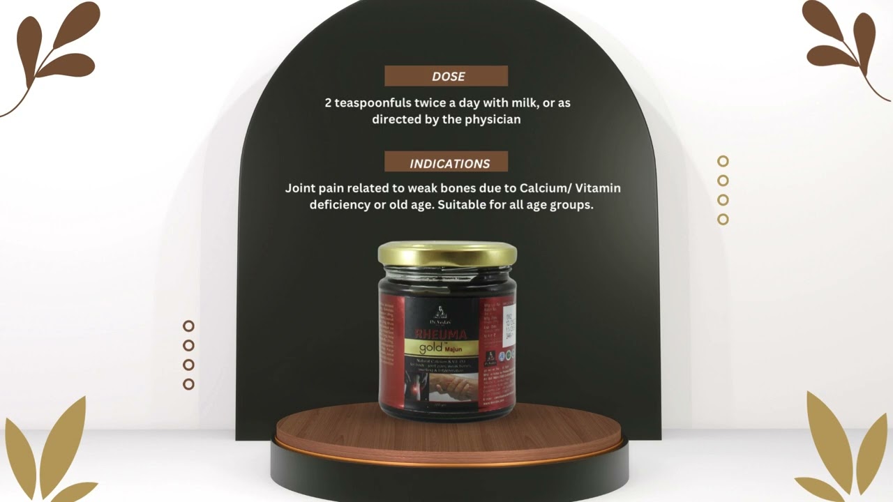Say goodbye to achy joints and hello to vitality with Dr. Veda's Rheuma Gold Majun - your ultimate source of calcium and vitamin goodness! Crafted with care and backed by science, this potent formula is designed to nourish your joints from within, promoting flexibility, strength, and overall well-being. Packed with the essential nutrients your body craves, including calcium and vitamin D, Rheuma Gold Majun is your daily dose of joint support in a convenient package. Whether you're an active individual looking to maintain peak performance or someone seeking relief from everyday joint discomfort, this golden elixir has you covered. Don't let joint issues hold you back any longer. Experience the golden standard in joint support with Dr. Veda's Rheuma Gold Majun and rediscover the joy of movement and vitality. Order now and embark on your journey towards healthier, happier joints!"
